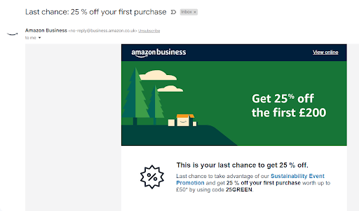 En una campaña de email de BOFU, Amazon Business ofreció en el Reino Unido un descuento promocional para animar a los clientes potenciales a abrir una cuenta. Al incluir las palabras “Última oportunidad” en el título, el correo electrónico generó una sensación de urgencia. En combinación con la oferta de descuento por compra, es un buen ejemplo de bottom-funnel marketing en el mundo del B2B.