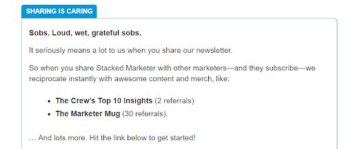 Si alguna vez ha tenido la oportunidad de leer la newsletter de Stacked Marketer, sabrás que está producido por expertos en marketing. Sus suscriptores reciben las últimas noticias y las opiniones más candentes en marketing a través de una newsletter diaria por email. Stacked Marketer aplica en el marketing post-funnel con su programa de recomendación, regularmente promocionado en la newsletter. Es sencillo, pero eficaz: los abonados pueden acceder a contenidos y productos exclusivos si recomiendan a nuevos abonados.