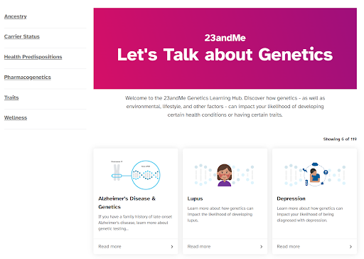 Como su servicio es bastante complejo, crearon un “Genetics Learning Hub”, que contiene una gran cantidad de recursos educativos para ayudar a su público a entender sus datos genéticos y sus implicaciones.