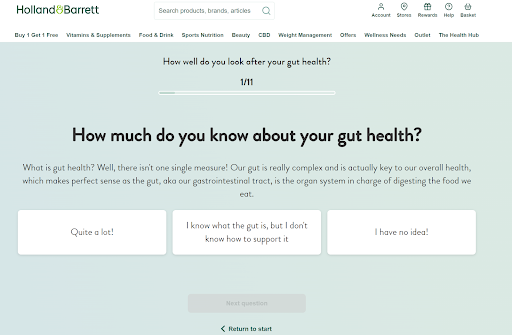 Un caso excelente del uso de contenidos interactivos en el marketing funnel es el de Holland & Barrett. Esta cadena multinacional de tiendas de alimentación saludable, con más de 1.300 establecimientos, está invirtiendo mucho en su presencia online.