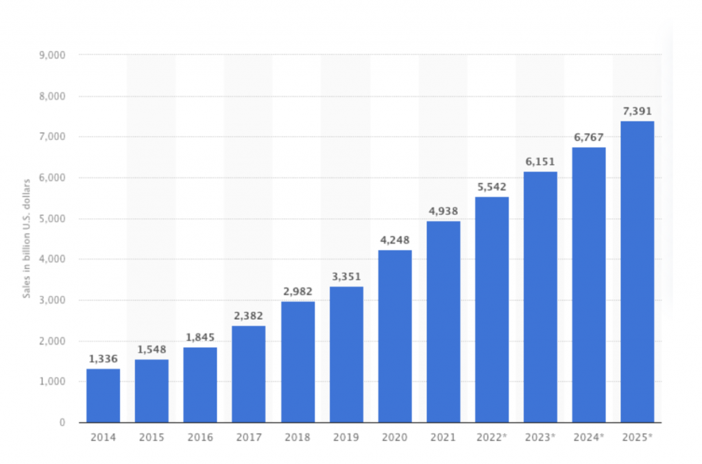 A menos que hayas estado dormido estos dos últimos años, sabrás que el e-commerce está por las nubes. Impulsado por los cambios en el comportamiento de los consumidores durante la pandemia, las compras online aumentaron considerablemente entre 2019 y 2020. De hecho, en 2021, las ventas de empresas ecommerce de retail alcanzaron la friolera de 4,9 billones de dólares en todo el mundo, y se espera que crezcan casi un 50% para 2025. ¡Echa un vistazo!