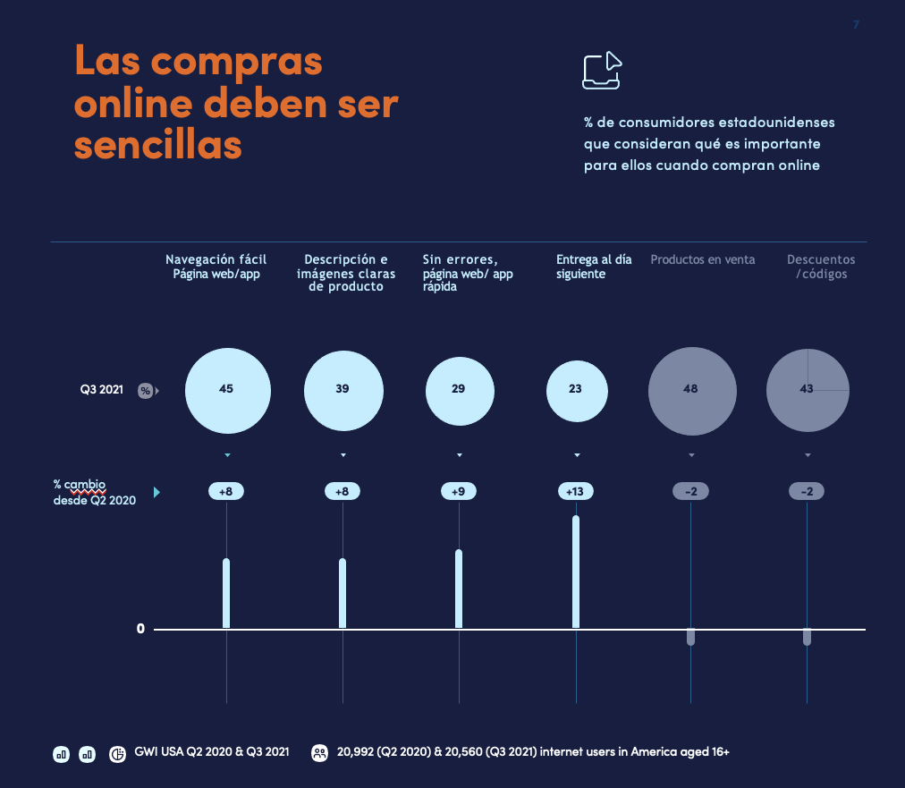 Las compras a través del móvil son ya un estándar para muchos usuarios online, y suponen más de la mitad de las ventas online. En estos pequeños dispositivos, la navegación debe adaptarse para que sea fácil y sencilla. La información de los productos debe ser fácilmente accesible, y la introducción y revisión de tallas y cantidades, así como las recomendaciones personalizadas de productos, deben realizarse sin esfuerzo y con tiempos de carga cortos. Según GWI, la usabilidad es importante para el 45% de los encuestados, casi tanto o más que la importancia del precio (48%) y los descuentos (43%). La rapidez de la app/página web y la facilidad de navegación registraron incrementos muy elevados del 9% y el 8%, respectivamente. Por tanto, esta temporada, los minoristas online deben dar prioridad a la optimización de su experiencia de compra digital.