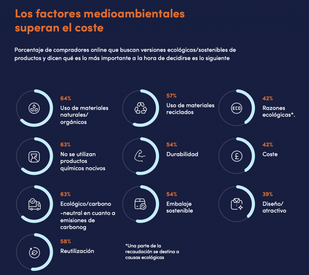 En varias categorías (alimentos, productos de limpieza, artículos del hogar, ropa), cerca de la mitad de los consumidores buscan opciones respetuosas con el medio ambiente. El uso de materiales ecológicos (importante para el 64%), la ausencia de productos químicos nocivos (63%), el transporte respetuoso con el medio ambiente (63%) y la reutilización (58%) son los factores más significativos. De hecho, son incluso más relevantes que el coste (42%) a la hora de tomar una decisión de compra. Los minoristas online que cumplen estos criterios deberían destacarlos de forma prominente en su página web. Además, también se pueden implementar embalajes sostenibles o envíos ecológicos, que sin duda ganarán la confianza de los clientes con mayor conciencia ecológica.