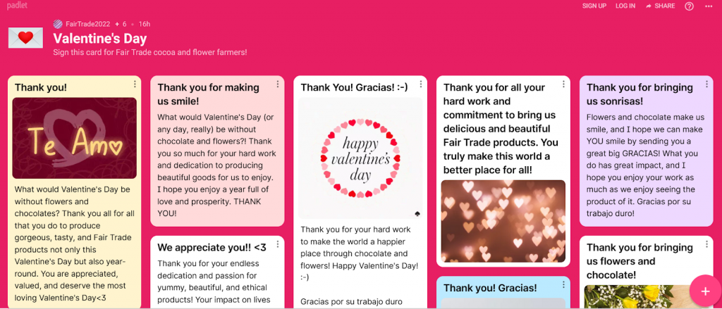 Selon Fair Trade, près de 250 millions de roses sont produites chaque année dans le monde rien que pour la Saint-Valentin ! Le cacao n’est pas en reste puisqu’il est l’un des ingrédients phares, et donc en très forte demande, pour célébrer la fête des amoureux. Qu’en est-il des agriculteurs qui travaillent sans relâche, souvent dans des conditions de travail (très) difficiles, pour satisfaire nos envies de cadeaux ? Avec sa campagne récente, Fair Trade a réussi à déplacer l’attention des consommateurs de manière habile en offrant plusieurs façons de “partager l’amour” tout en soutenant les producteurs. Nous aimons tout particulièrement le “Valentin virtuel” : un tableau en ligne qui permet de partager des messages de soutien aux producteurs de fleurs et de cacao membres de Fair Trade. Félicitations !