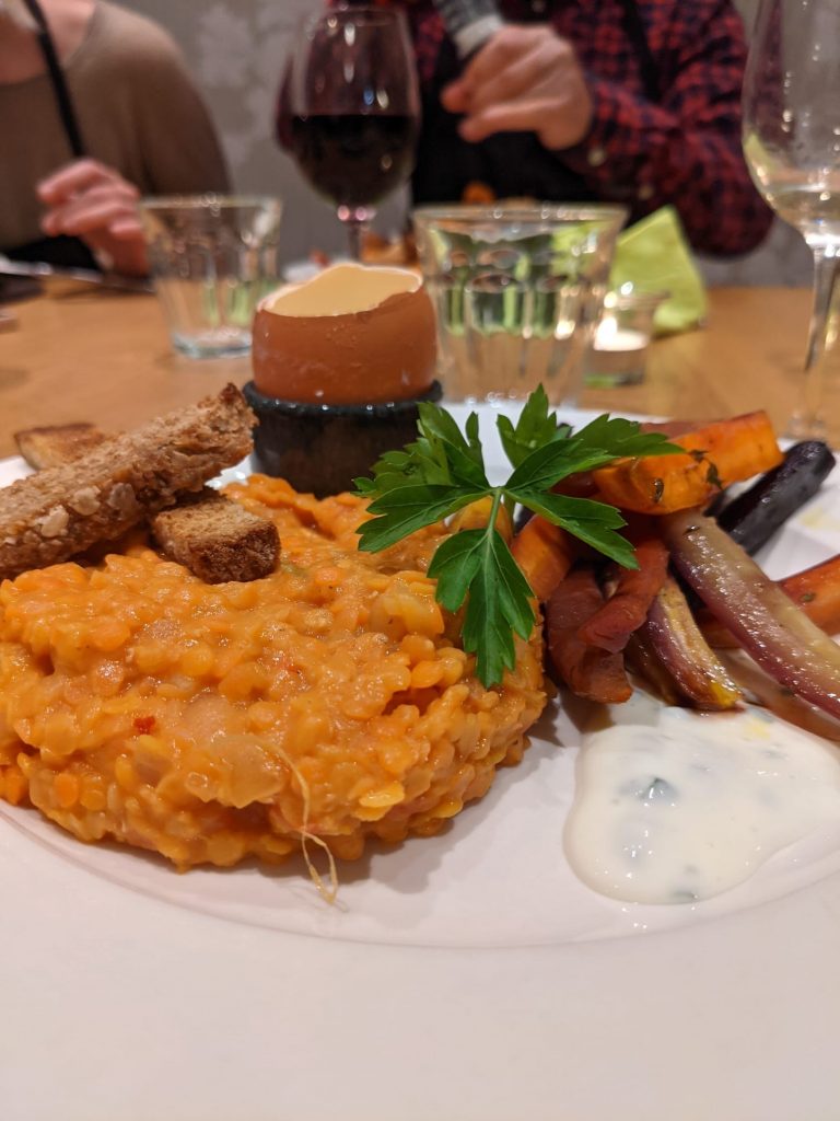- Main: Dhal of coral lentils with coconut milk, soft boiled egg & roasted veggies… bluffing!